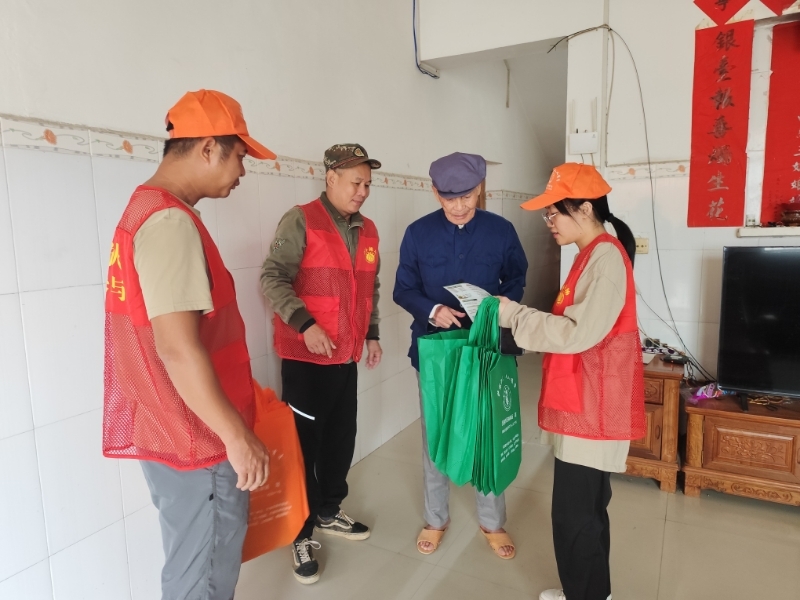 图为宣传人员现场向群众发放森林防火宣传资料及宣传品
